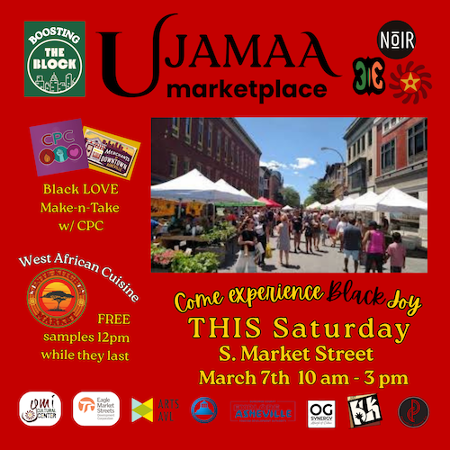 Come celebrate with us at the Ujamaa Marketplace this Saturday, March 7, between 10 am and 3 pm, part of the Boosting the Block initiative that seeks to connect Asheville’s historic Black business district to Pack Square.